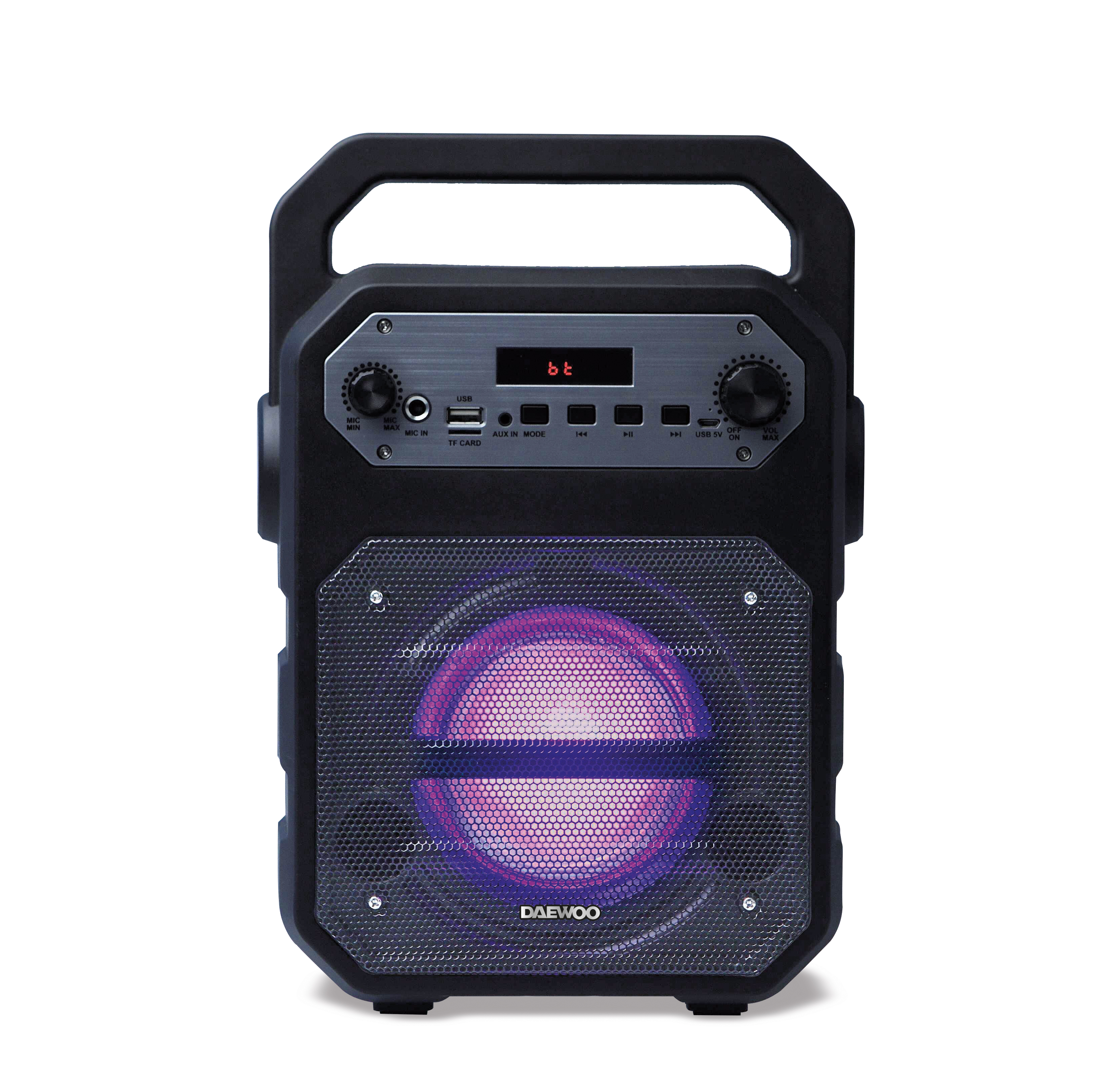 Daewoo Bluetooth speaker with open listening, 15W power, wired microphone (included), FM radio, rechargeable battery.