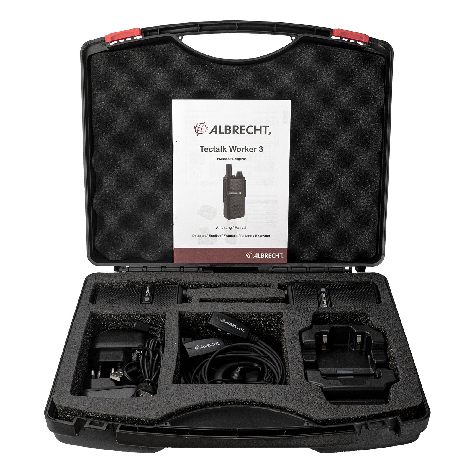 Περιεχόμενα συσκευασίας: Δύο TECTALK WORKER 3, δύο κλιπ ζώνης, δύο επιτραπέζιες βάσεις φόρτισης, δύο μπαταρίες τεχνολογίας Li-ion με χωρητικότητα 2200 mAh, δύο ακουστικά handsfree, ένα βαλιτσάκι και οδηγίες χρήσης.